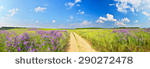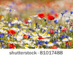 - Wir sehen ein weites Ackerfeld, über dem Feldblumen in den verschiedensten Farben wachsen (grün, gelb, rosa, blau und rot).
